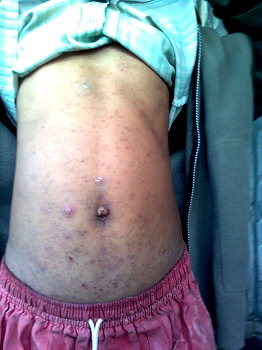 Adolescent. Le corps est couvert de boutons plus ou moins gros, certains rouges, d'autres ayant percé. Il semble que ce ne soit pas la gale, les boutons sont un peu partout sur le corps.