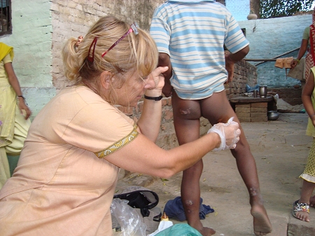 Volontaire soignant un enfant. Boutons qui s'étalent et s'infectent sur les fesses et les chevilles.