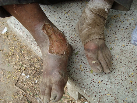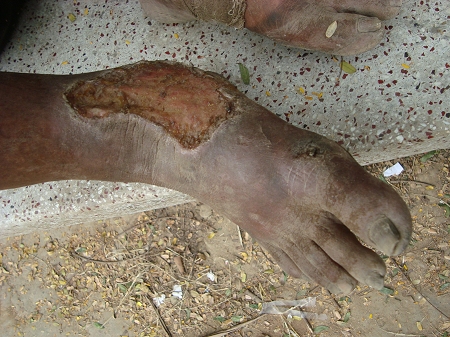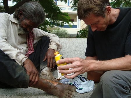 Homme mendiant. Depuis plusieurs années il parcours Varanasi avec ses bandages. Les associations où il va ou qui le trouvent (comme ici avec nous) lui refont ses bandages. Deux grosses plaies ne cicatrisent pas. D'abord parce qu'il ne fait pas les soins tous les jours (loin de là), mais surtout parce qu'il serait drogué, ce qui empècherait la cicatrisation. Impressionnant du peu d'évolution !